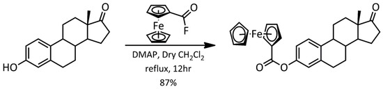 Ferrocene–hormone complex 2 was synthesized using estrone and fluorocarbonyl ferrocene as the starting materials. The reaction scheme is shown in Figure 2. The reaction was performed using 4-(dimethylamino)pyridine in dry CH2Cl2 under reflux for 12 h. Single crystals were obtained using the liquid–vapor diffusion technique. This compound was characterized using Nuclear Magnetic Resonance Spectroscopy (NMR; Figures S1 and S2 in Supplementary Materials), Fourier Transform Infrared Spectroscopy (FT-IR; Figure S3), and X-ray Diffraction (XRD).