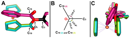 Gas-phase optimization and relaxed potential energy surface (PES) scan studies were performed using Gaussian16W [31] software. The crystal structures of 2 and 4 were used as starting points for the gas-phase optimization. The optimization of each structure was performed using the density functional theory (DFT) and B3LYP [32] hybrid density functional methods. Since derivative 2 contained a metal in its structure, both optimizations were performed with the LANL2DZ [33,34] level of theory as a basis set. Harmonic vibrational frequencies were calculated for the optimized structures to confirm that the geometries obtained were minima. No imaginary frequencies were found. The resulting optimized structures were then utilized to perform the relaxed PES scan studies. The C2-C1-O1-C19 dihedral angle was studied in 72 steps (at 5 degrees from each step) using the same parameters selected for the gas-phase optimization.