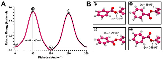 A similar behavior was observed in the PES scan of benzyl–hormone conjugate 4 (Figure 8A). Conformers that corresponded to the local maxima (b and d) were found to have the plane of the benzyl substituent perpendicular to the aromatic ring plane in the hormone moiety. The structure with the highest energy exhibited a dihedral angle of 89.96° (Figure 8B). Meanwhile, the conformers with lower energies were found to have coplanar aromatic planes (a and c). The lowest-energy conformer (c) had a dihedral angle of 183.30°. The rotational barrier of benzyl–hormone complex 4 was 0.803 kcal/mol.