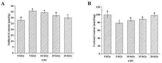The sulfhydryl group is susceptible to oxidative modification and it has an important contribution to protein functionality [22]. Oxidation of the sulfhydryl group may therefore affect the protein functionality. Results showed that the total sulfhydryl content of CPC was higher in irradiated groups than in the unirradiated group (Figure 1A). With an increased irradiation dose, sulfhydryl content decreased. Protein carbonyl content has been widely used as an indicator to evaluate protein oxidation [23]. The carbonyl content increased with an increasing irradiation dose, but the control group was higher than groups of 5–15 kGy (Figure 1B).
