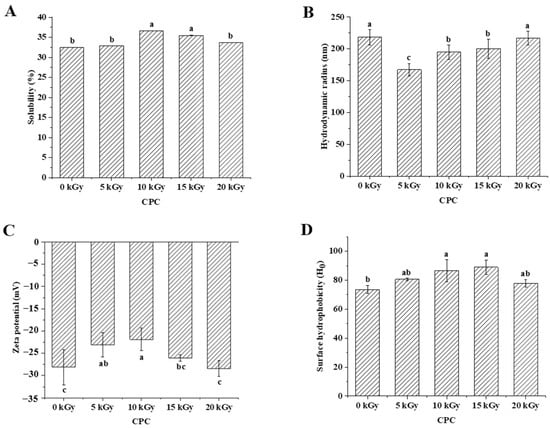 Effect of EBI on the solubility (A), hydrodynamic diameter (B), zeta potential (C), and surface hydrophobicity (D) of CPC. Different letters (a, b, c) indicate significant differences (p < 0.05).