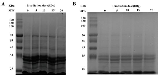 Solubility is an important physicochemical property of proteins, reflecting the interactions between proteins and between proteins and water, and can influence the functional properties of proteins [24]. Figure 2A showed that the solubility of CPC increased and then decreased with an increasing irradiation dose. The solubility increased significantly at a dose of 10 kGy compared to the unirradiated samples. There was no further increase when the dose increased to 15 kGy. When the dose reached 20 kGy, the solubility decreased to a similar level of unirradiated. The solubilized proteins were subjected to SDS polyacrylamide gel electrophoresis analysis, and the results showed that the intensity of major protein bands was greater in CPC irradiated with 5, 10, and 15 kGy (Figure 3).