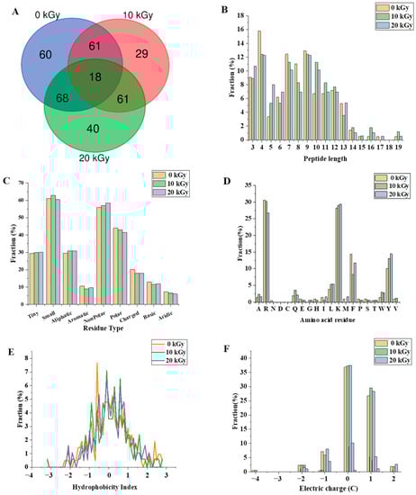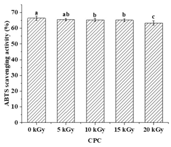 The digested CPC (0, 10, and 20 kGy) was further analysed through peptidomics. A total of 337 peptides were identified from the gastrointestinal digestion products of CPC treated with 0 kGy, 10 kGy, and 20 kGy irradiation doses (Figure 5A), with 18 overlapping peptides and 60, 29, and 40 peptides specific to 0, 10, and 20 kGy irradiation doses, respectively. A full list of those peptides can be found in the Supplementary File. The majority of peptides identified had a length of 3–13 residues (Figure 5B), with only about 2% having more than 14 residues. Irradiation generally led to a higher proportion of larger peptides. In terms of the amino acid composition of the peptides, more non-polar amino acid residues were found in irradiated groups (Figure 5C). When the C-terminal was considered alone, it was found that the two major residues were lysine and arginine, and irradiation appeared to increase the frequency of lysine while decreasing the frequency of arginine in the C-terminal of identified peptides (Figure 5D). The theoretical hydrophobicity and net charge of the peptides were also estimated (Figure 5E,F). The overall mean value of hydrophobicity was estimated using the Kyte-Doolittle scale, where scores below 0 indicate hydrophilicity, and values above 0 indicate hydrophobicity [28,29]. Overall, there were slightly more hydrophobic than hydrophilic peptides. The net charges of the three sample peptides were mainly 0 C and 1 C. The generated peptides may have various potential biological activity. The ABTS radical scavenging test showed that the antioxidant capacity of the digested products decreased slightly with increased irradiation (Figure 6).