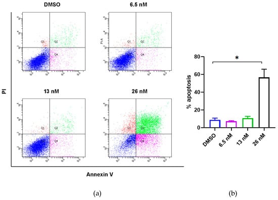 The cells were seeded in a 6-well plate (250,000 cells) and incubated for 24 h at 37 °C with 5% CO2. After settling, cells were further incubated in the absence or presence of 1 at the concentrations of 6.5, 13, and 26 nM to induce apoptosis for 48 h. The cells were harvested after the incubation period and washed in cold phosphate-buffered saline. The washed cell pellets were resuspended in 100 μL 1× annexin-binding buffer per assay, with 5 μL of FITC annexin V and 1 μL of the 100 μg/mL PI working solution added. The cells were incubated at room temperature for 15 min. After the incubation period, 400 μL of 1× annexin-binding buffer was added and mixed gently on ice. The stained cells were then analyzed by FACS Calibur™ (BD Biosciences, San Jose, CA, USA).