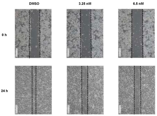 To fully elucidate the anticancer properties and examine whether compound 1 also affects cellular mobilization of HCT116 cancer cells, scratch wound assay was utilized after applying indicated concentrations of 1. In Figure 4, we observed that the treatment with 1 at 3.25 and 6.5 nM significantly inhibited the mobilization of HCT116 cells in a dose-dependent manner, whose healing effects were obvious after 24 h. We thus conclude that the healing effects of HCT116 cells have been inhibited when treated with 1 from 0 to 6.5 nM in vitro.