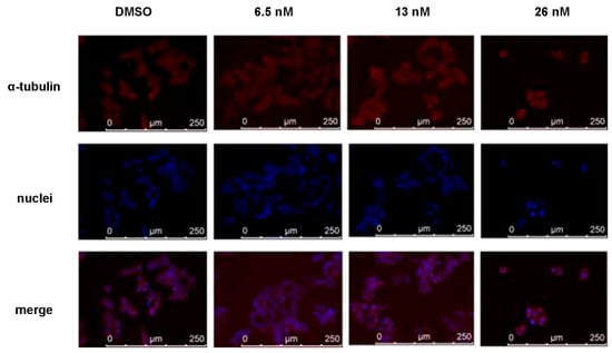 HCT116 cells were seeded in 6-well plates on slides and cultured with full medium with or without compound 1 at different concentrations for 48 h. The seeding density was 300,000 cells with 2 mL medium per well. After fixation in ice-cold acetone: MeOH (1:1, v/v) for 20 min, cells were incubated with anti-α-tubulin antibody followed by fluorescent-conjugated secondary antibody, visualized, and imaged by a microscope (Leica AF6000, Hong Kong SAR, China).