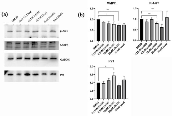 To test the effects of compound 1 on apoptosis and migration regulatory proteins in HCT116 cancer cells, we performed western blotting analysis. Figure 6 showed that 1 could decrease the protein expression of pAKT and MMP2, while increasing the protein expression of p21. These regulations are all dose dependent, and the effects are most significant at the concentration of a 13 nM treatment. Collectively, our results suggest that the antitumor effect of 1 is majorly associated with the p21-mediated apoptosis and MMP2-mediated migration, which are both regulated by their upstream, phosphorylated AKT.
