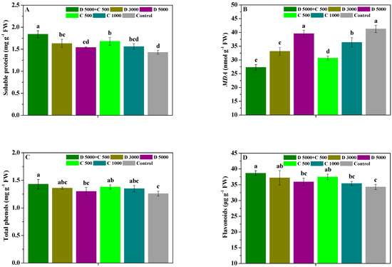 The influences of difenoconazole and chitosan on the soluble protein (A), MDA (B), total phenols (C), and flavonoid (D) contents in P. heterophylla leaves. Error bar represents SD; small letters indicate significant differences at 5% (p < 0.05) level.