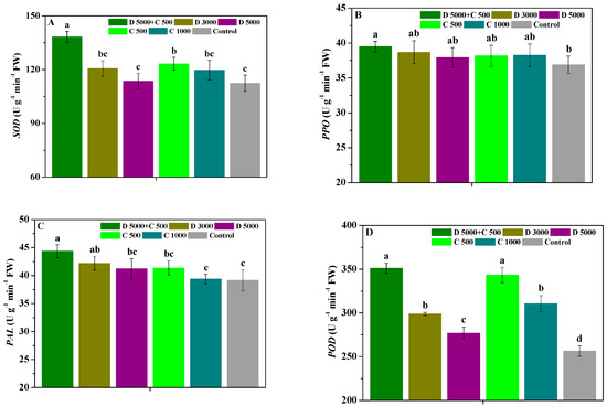 The influences of difenoconazole and chitosan on the SOD (A), PPO (B), PAL (C), and POD (D) activities in P. heterophylla leaves. Error bar represents SD; small letters indicate significant differences at 5% (p < 0.05) level.