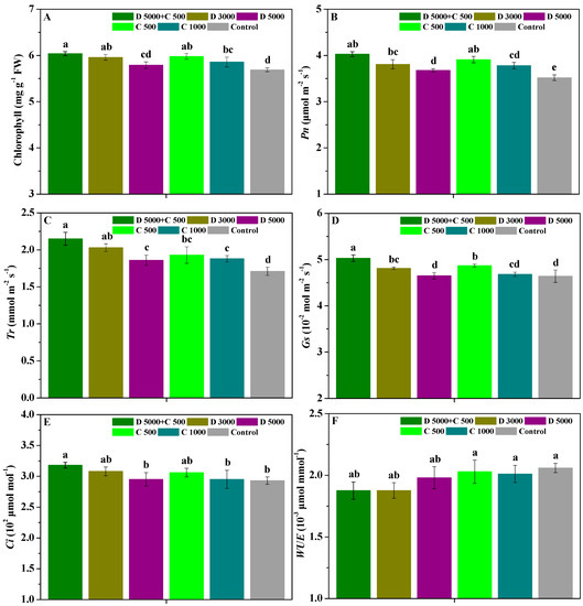 The influences of difenoconazole and chitosan on the chlorophyll (A), Pn (B), Tr (C), Gs (D), Ci (E), and WUE (F) in P. heterophylla leaves. Error bar represents SD; small letters indicate significant differences at 5% (p < 0.05) level.