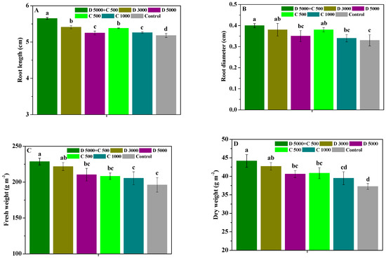 The influences of difenoconazole and chitosan on root length (A), root diameter (B), fresh weight (C), and dry weight (D) in P. heterophylla roots. Error bar represents SD; small letters indicate significant differences at 5% (p < 0.05) level.