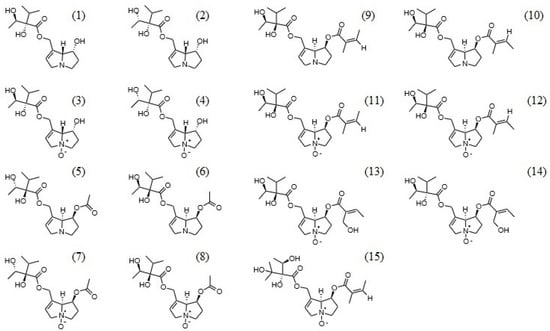 Chemical structures of main pyrrolizidine alkaloids detected in comfrey (Symphytum officinale) roots. (1)—intermedine, (2)—lycopsamine, (3)—intermedine N-oxide, (4)—lycopsamine N-oxide, (5)—7′-acetylintermedine, (6)—7′-acetyllycopsamine, (7)—7′-acetylintermedine N-oxide, (8)—7′-acetyllycopsamine N-oxide, (9)—symphytine, (10)—symlandine, (11)—symphytine N-oxide, (12)—symlandine N-oxide, (13)—7′-sarracinyl-9-trachelanthylretronecine N-oxide, (14)—7′-sarracinyl-9-viridiflorylretronecine N-oxide, (15)—echimidine N-oxide.