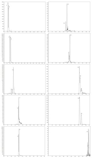 Due to the lack of standard compounds among the remaining pyrrolizidine alkaloids, their identification was based on the literature describing the characteristic MS2 fragments for each of them [,,,]. Taking into account the fact that some compounds may not be sufficiently separated, yielding single peaks on the TIC (total ion chromatogram) chromatogram, automatic optimization of ESI ionization conditions was used to determine the correct precursor ion and transition. The applied collision energies were determined on the basis of the highest peak intensities observed for individual transitions. The appropriate collision energies were selected in the range from −15 eV to −45 eV, in steps of 5 eV.
