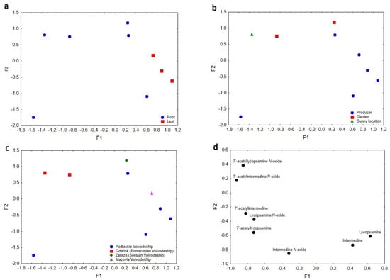 In Figure 3a, the comfrey samples have been differentiated according to the anatomical part of the plant (root–leaf). Factor 1 was mainly responsible for this diversification. Its high values distinguished the comfrey leaf samples, which have been described in terms of lycopsamine and intermedine. Low values of F1 characterized root samples, and 7′-acetylintermedine N-oxide, 7′-acetyllycopsamine N-oxide, 7′-acetylintermedine, 7′-acetyllycopsamine, intermedine N-oxide, and lycopsamine N-oxide were responsible for their separation (Figure 3d).