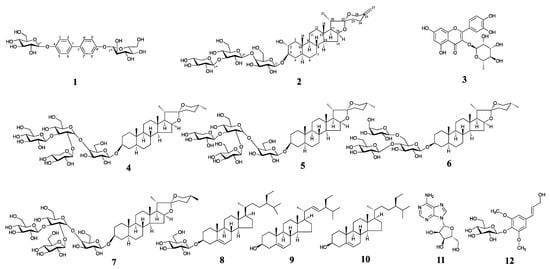 In addition, the structures of quercitrin (3) [22], dongnoside E (4) [23], desgalactotigonin (5) [24], smilaxin C (6) [25], macrostemonoside A (7) [26], daucosterol (8) [27], stigmasterol (9) [28], β-sitosterol (10) [29], adenosine (11) [30] and syringin (12) [31], were determined by comparison with spectral data reported in the literature (Figure 1, see Table S1 for carbon spectral data). Among them, compounds 3–6 were first discovered from the plant.
