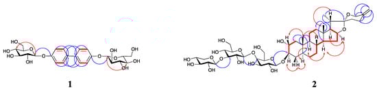 Key 1H-1H COSY (in red bold), HMBC (blue arrows) and NOESY (red arrows) correlations of compounds 1–2.