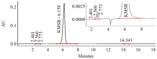 A biocatalytic synthesis of KMSB (Figure 1) was carried out from a 0.1 M aqueous solution of L-selenomethionine. The kinetics of formation of the target compound and by-products was monitored by HPLC. To this end, optimal conditions for chromatographic analysis were selected to ensure reliable determination of the components of the reaction mixture during the reaction time (see Section 4.3—Monitoring the progress of a biocatalytic reaction). After completion of the reaction and purification of the target product, the KMSB preparation was obtained in the form of a highly concentrated aqueous solution of sodium salt. Including the isolation and purification steps, the total yield of KMSB was over 67% and the chemical purity, according to HPLC data, was over 99.3%. Figure 2 shows the complete absence of the original L-selenomethionine in the resulting KMSB preparation.