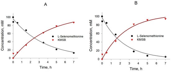 The developed HPLC method for determining the components of the reaction mixture made it possible to trace the kinetics of L-selenomethionine consumption and KMSB formation during the biocatalytic conversion (Figure 5).