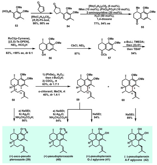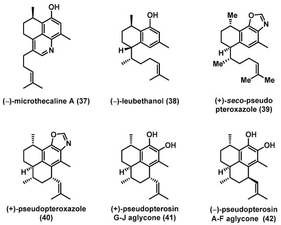 Total syntheses of terpenoids (+)-seco-pseudopteroxazole (39), (+)-pseudopteroxazole (40), (+)-pseudopterosin G–J aglycone (41), and (−)-pseudopterosin A–F aglycone (42).