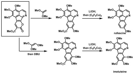 - Boger, D.L.; Brotherton, C.E. Total Synthesis of Azafluoranthene Alkaloids: Rufescine and Imeluteine. J. Org. Chem. 1984, 49, 4050–4055. [Google Scholar] [CrossRef]