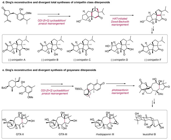 In 2023, the Ding group finished the deconstructive and divergent syntheses of nine grayanane diterpenoids that belong to five distinct subtypes from a common advanced tetracyclic intermediate which was prepared through a tandem intramolecular oxidative dearomatization-induced (ODI) [5 + 2] cycloaddition/pinacol rearrangement to construct [3.2.1]-bicyclic skeleton and a photosantonin rearrangement to assemble the 5/7 bicyclic framework (Scheme 2e) [17].