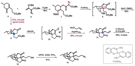 After optimization of the Mukaiyama–Michael addition conditions, coupling of two simple building blocks 5 and 6 was realized in the presence of triflimide to afford silyl ether 7 with excellent yield and high diastereoselectivity (Scheme 4). Then, Cu(tbs)2-catcalyzed carbene cyclization designed by our group was successfully conducted, and decarboxylation of the resulting cyclization product provided the desired ketone 9 with a cis-6/5 bicyclic skeleton and a quaternary carbon center with a 55% yield [22]. The bicycle 9 could also be scalable prepared with good yield by using a one-pot operation. Notably, this novel methodology offers an efficient way to construct the cis-6/5 bicyclic skeleton from simple building blocks which can apply to the total synthesis of other complex natural products. Then, Dickmann condensation of the ketone ester 9 gave an enolate of tricyclic trione 10, which in situ reacted with π-allylpalladium complex to deliver the tricyclic compound 11 with angular 6/5/5 tricyclic molecular framework bearing two quaternary carbon centers. Selective protection of the ketone on the six-membered ring and hydroboration of the terminal double bond of 11 gave the desired alcohol 12, which could readily be converted into the common intermediate, the tricyclic azide 13, through the Mitsunobu reaction.