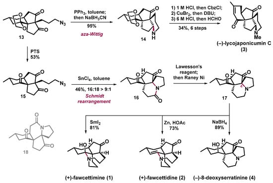 In 2013, Tu’s group reported a creative approach to divergent synthesis of four fawcettimine-class Lycopodium alkaloids, namely, fawcettimine (1), fawcettidine (2), lycojaponicumins C (3), and 8-deoxyserratinine (4) [21]. In this work, the authors designed a common intermediate which can transform to alkaloids 1–4 in a divergent manner. Meanwhile, a practical methodology to quickly construct the cis-hydroindene skeleton was designed and developed to demonstrate that natural product total synthesis can promote the development of novel synthetic methodologies and synthetic strategies.