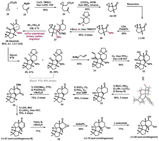 This work started with the preparation of enantioenriched cyclobutanone 25 that was obtained via chiral resolution of racemic 25, which was prepared in two steps from simple building blocks 22 and 23 via 1, 4-addition, and [2 + 2] cyclization (Scheme 6). The well-designed vinyl cyclobutnol silylether precursor 27 was successfully synthesized by coupling known vinyl bromide A and phenylthiol-cyclcobutanone 26, which was obtained from enantioenriched 25 and phenyl disulphide in the presence of LDA. The phenylthioether group was firstly introduced to adjust the electron density of expected carbon in semipinacol rearrangement, aiming to enhance a dominated migration of the expected carbon of the rearrangement precursor 27. Fortunately, under the BF3·OEt2/DCM condition, the expected semipinacol rearrangement occurred and provided the desired spirocyclic product 28 bearing the correct quaternary carbon center with an 80% yield and with a ratio of 1.2:1 at the C9 position. The structure and stereocenters of 28 were confirmed via X-ray crystallographic analysis of its derivative 32 (vide infra). After serval chemical operations, the last five-membered ring of the target molecule was successfully constructed via acid-promoted Aldol cyclization of aldehyde, which was obtained from terminal olefin 31 through Ozonization. After removal of the unnecessary functional group on the triquinane (5/5/5 tricyclic) motif, tetracycle 35 was obtained with a high yield. Then, stereoselective installation of a methyl group in the presence of LDA and LiAlH4 reduction of the resulting ketone, followed by quenching with HCl aqueous solution to install the enone motif, provided conidiogenone B (21) with a 70% yield. However, the positive optical rotation and CD spectrum data of synthetic conidiogenone B were opposite to those of the natural occurring one. Thus, the correct absolute configuration of naturally occurring conidiogenone B (21) is, in fact, the enantiomer of the originally assigned absolute configuration. Meanwhile, stereoselective epoxidation of conidiogenone B, followed by reduction of the resulting epoxide with NaSePh, afforded conidiogenone (19) with a 54% yield over two steps. Finally, diastereoselective reduction of conidiogenone (19) with L-selectride gave another diterpene conidiogenol (20) with a 77% yield.