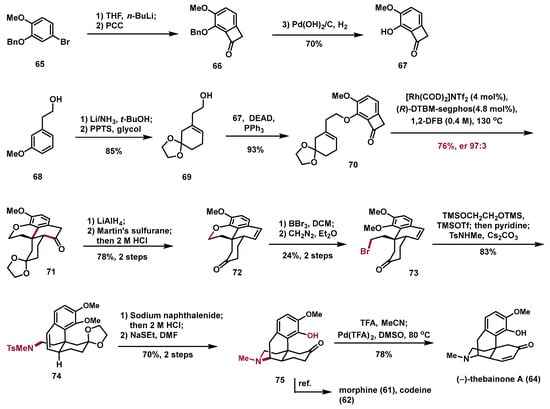 According to the previously synthetic route, benzocyclobutenone 67 was prepared from commercially available compound 65 in three steps on a decagram scale with a 70% overall yield, while alcohol 69 was accessed through Birch reduction and ketal formation of commercially available anisole 68 (Scheme 9). Mitsunobu coupling of phenol 67 and alcohol 69 delivered the desired precursor 70 with a 93% yield. Because of the acid-sensitive ketal, sterically hindered trisubstituted olefin, and relatively long linker of compound 70, the efficiency of C–C activation is a challenge. After screening a series of C–C activation reaction conditions, we successfully realized Rh-catalyzed enantioselective C–C activation and obtained the desired tetracyclic compound 71 with a 76% yield with 97:3 er on a gram scale. Notably, compound 71 contains the all-carbon fused 6/6/6 rings bearing the quaternary carbon centers of the target molecules. This step not only sets the requested stereochemistry at the C13 and C14 positions but also forms all the C−C bonds present in the natural products. Compound 71 transformed into styrene 72 with a 78% yield via LAH-reduction, elimination, and deprotection. Cleavage of the C−O bond with BBr3, followed by methylation of the resulting diphenol provided the desired alkyl bromide 73. Then, a one-pot sequence of ketal installation and SN2 amination of alkyl bromide smoothly delivered sulfonamide 78, which could provide the common intermediate 75 through formal hydroamination under a sodium naphthalenide condition to construct the piperidine and selectively deprotect the more sterically hindered methyl ether in the presence of NaSEt. The common intermediate 75 could not only transform into morphine alkaloid (−)-thebainone A (64) through desaturation under Stahl’s condition but also serve as a known precursor for the syntheses of codeine (61) and morphine (62) [13].
