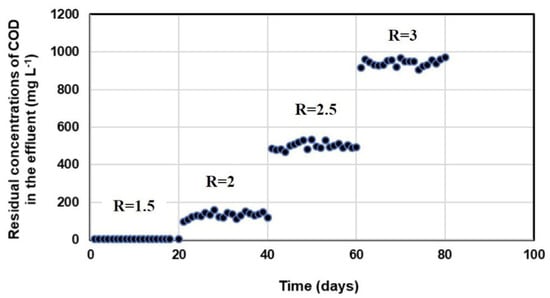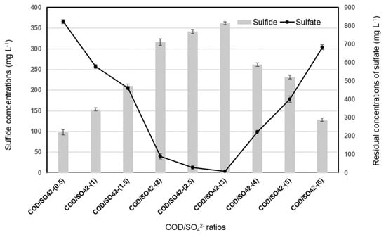 Figure 2 shows the residual concentrations of COD at various COD/SO42− ratios (1.5; 2; 2.5, and 3). These results indicate that when the COD/SO42− ratio increased to more than 1.5, sulfate reduction and sulfide production were improved (Figure 1), whereas COD was incompletely oxidized (Figure 2).