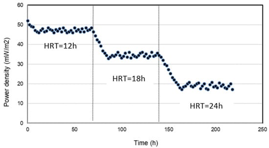 Power density in the SOFC at different HRTs (12, 18 and 24 h) with time.