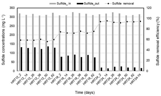 Sulfide removal efficiency in the SOFC at different HRTs (12, 18 and 24 h) with time.