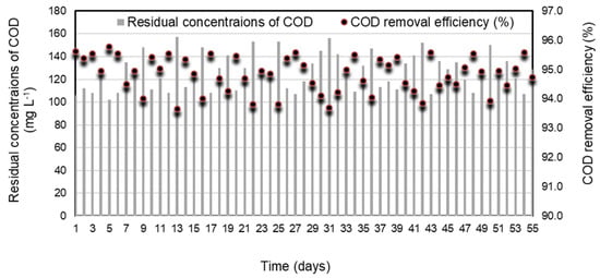 Removal efficiency and residual concentrations of COD in SRBR with time.