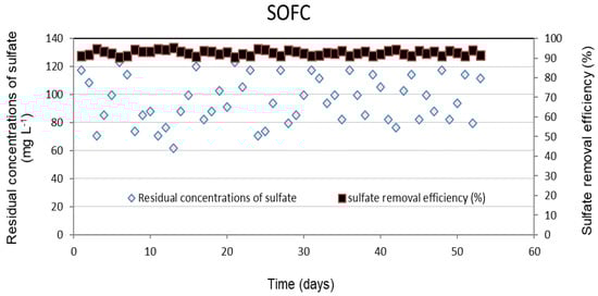 MFCs often faced trade-off in aspects of electricity generation and pollutant removal []. Based on the consent MFC technology should be applied as a waste/wastewater treatment unit rather than a renewable energy source. In this study, considering the sulfide removal efficiency, which is one of the most important values in a wastewater treatment system, the optimum HRT was determined to be 24 h. The continuous operation of the treatment system was carried out for 63 days with the optimum COD/SO42− ratio and HRT. The results indicated that the COD and sulfate removal efficiencies were stable in SRRB, reaching 94.8 ± 0.6% and 93 ± 1.3% during the operation. Electricity was generated continuously and stably (18 ± 1.6 mW/m2) from the sulfide oxidation process of SOFC for the first 45 days with 93 ± 1.2% of the sulfide being oxidized from the anode chamber. However, the sulfide removal efficiency and power density decreased gradually after 45 days. At the end of the operation, sulfide removal efficiency and power density were 68% and 7.2 W/m2, respectively.