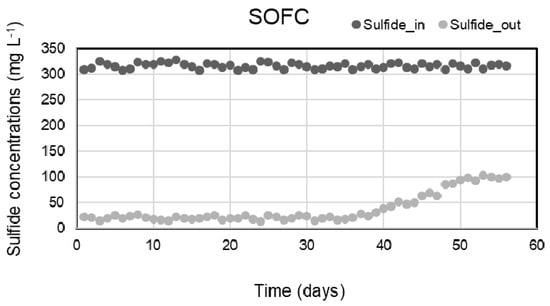 Sulfide concentrations in the influent and effluent of SOFC with time.