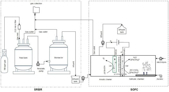 The system consisted of two identical components: (1) a SRBR to reduce sulfate to sulfide; (2) a SOFC to oxidize subsequently sulfide to element sulfur (S°)/sulfate (SO42−). The integrated use of SRBR and SOFC can remove organic matter (COD), sulfate and sulfide simultaneously with electricity generation. The experimental apparatus is illustrated in Figure 10.