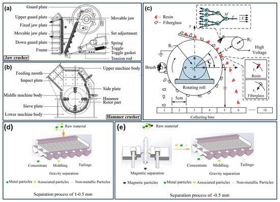 Schematic presentation of conventional WPCB crushers: (a) Jaw crusher and (b) hammer crusher. Reprinted with permission from [62]. Copyright: 2020, American Chemical Society. (c) Diagram of the roll-type corona electrostatic separator. Reprinted with permission from [68]. Copyright: 2014, American Chemical Society. Schematic of recovery process for metal components via (d) single gravity separation and (e) combined magnetic separation and gravity separation. Reprinted with permission from [61]. Copyright: 2020, Elsevier.