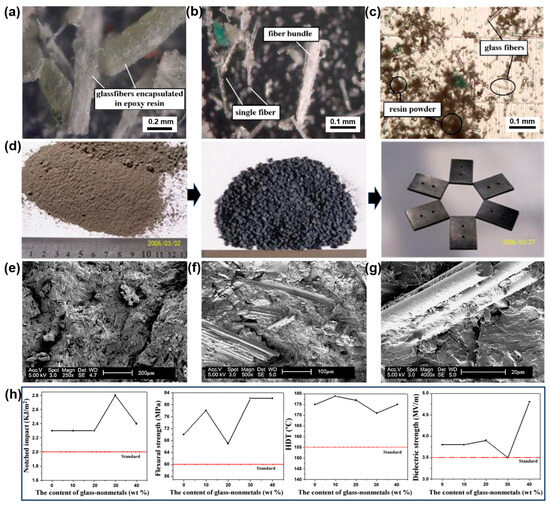 Micrographs of WPCB non-metals with different particle sizes: (a) 0.3–0.125 mm, (b) 0.125–0.07 mm, (c) <0.07 mm; (d) schematic illustration of the preparation of PMC filled with WPCB non-metals; SEM images of the fractured morphologies of (e) ordinary PMCs and (f,g) PMCs filled with WPCB non-metals; (h) properties of PMC with WPCB non-metals. Reprinted with permission from [75]. Copyright: 2008, Elsevier.