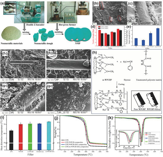 (a) Schematic illustration of the production of the NMP. Reprinted with permission from [88]. Copyright: 2008, American Chemical Society. (b,c) SEM images of the fractures of UPE/pre-PU–WPCB non-metal composites; (d) tensile strength and flexural strength of the UPE composites; (e) impact strength of the UPE composites. Reprinted with permission from [89]. Copyright: 2017, Wiley. SEM images of UPE composites filled with (f1,f2) WPCBP and (g1,g2) m-WPCBP-SiO2 hybrid filler; (h) proposed model of the reinforcing mechanism of UPE composites; (i) heat distortion temperature, (j) TGA, and (k) DTG curves of UPE and different UPE composites. Reprinted with permission from [90].