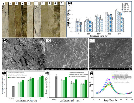 Digital images of flexural samples (a) before weathering and (b) after 2000 h of accelerated weathering; (c) carbonyl index of unfilled rHDPE and rHDPE/PCB composites after accelerated weathering. Reprinted with permission from [109]. Copyright: 2015, Wiley. SEM images of PVC composites with (d) untreated 30 wt% NMPCB; (e) 30 wt% NMPCB-treated ATPS; (f) 30 wt% NMPCB-treated PP-g-MA; (g) Young’s modulus of PVC/NMPCB composites; (h) tensile strength of PVC/NMPCB composites; (i) influence of interfacial modifiers on the loss factor or tan δ of PVC/NMPCB composites. Reprinted with permission from [116]. Copyright: 2023, MDPI.