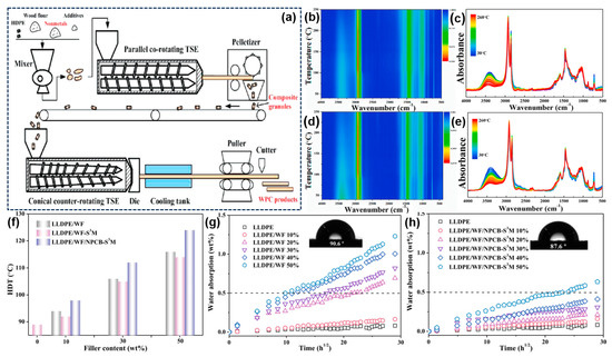 (a) Flowchart detailing the preparation of WPC products. Reprinted with permission from [25]. Copyright: 2010, American Chemical Society. In situ FTIR contour map and the corresponding spectra for the (b,c) LLDPE/WF composites and (d,e) LLDPE/WF/NPCB−S3M composites; water absorption by the (f) LLDPE/WF and (g) LLDPE/WF/NPCB−S3M composites; (h) heat deflection temperature of the LDPE composites. Reprinted with permission from [124]. Copyright: 2020, Elsevier.