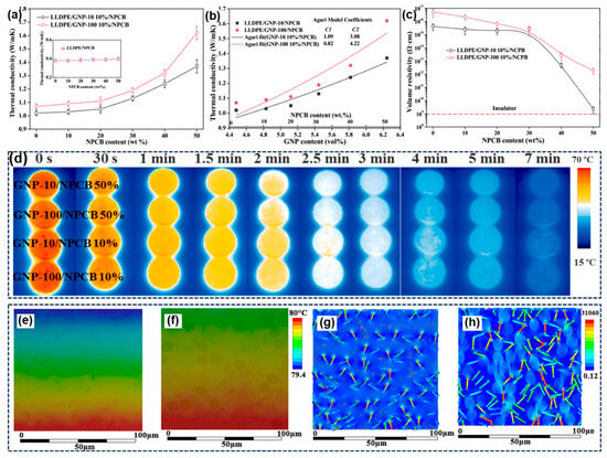 (a) Thermal conductivity and (b) the Agari model fitting curves of LLDPE composites; (c) volume resistivity of composite with various NPCB contents; (d) infrared thermal images of different samples; temperature and heat flux distributions of LLDPE/GNP (e,g) and LLDPE/GNP/NPCB (f,h) composites in finite element models. Reprinted with permission from [125]. Copyright: 2020, Elsevier.