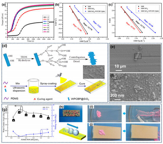 (a) Vulcanization curves of SBR compounds; linear fitting used to calculate Ea via the (b) Ozawa and (c) Kissinger method. Reprinted with permission from [73]. Copyright: 2020, Wiley; (d) schematic presentation of the fabrication of WPCBP@SiO2 and PDMS/WPCBP@SiO2 coatings; (e,f) SEM images of WPCBP@SiO2 hybrid fillers with different magnification values; (g) water contact and sliding angles of PDMS/WPCBP@SiO2 coatings; (h) digital images of water droplets on the PDMS/WPCBP@SiO2 coating; self−cleaning photographs of (i) blank glass and (j) PDMS/WPCBP@SiO2 coatings. Reprinted with permission from [134]. Copyright: 2021, Wiley.
