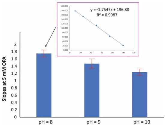 Effect of the pH on the sensitivity of the assay (mean values of slopes ± S.D., n = 3); [OPA] = 5 mM, reaction time = 15 min.