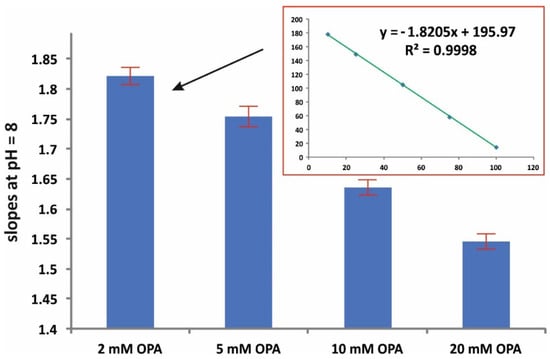 Effect of the amount concentration of OPA on the sensitivity of the assay (mean values of slopes ± S.D., n = 3); pH = 8, 15 min reaction time.