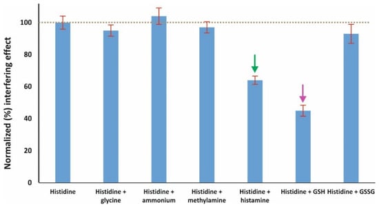 Selectivity of the developed assay; the amount concentration of histidine is 50 μM and of each interferent 100 μM (mean values ± S.D., n = 3); the arrows point out the two most important interferences.