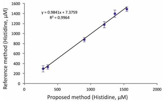 The evaluation of the applicability of the proposed high-throughput assay in real-world analyses was based on the determination of histidine in six human urine samples. The collection, preservation, and processing of the samples is described in detail in the experimental section below. As can be seen in the results of Table 7, the concentration of the analyte ranged between 280 and 1540 μM. Table 6 also contains the results from the analysis of the same samples by a corroborative HPLC method. The graphical comparison presented in Figure 5 indicates good correlation between the proposed and reference methods, while representative urine chromatograms from the HPLC method can be seen in Figure S2 (Supplementary Materials). Additionally, the levels of histidine in the urine samples are in good correlation to the reference values for adults (>18 years, n = 800) that were reported in the literature [38].