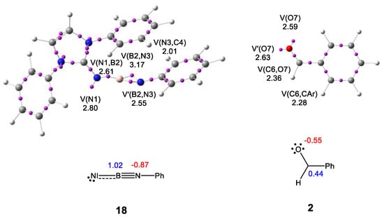 QTAIM analysis of N-phenyl iminoborane 18 provides electron density ρ(r) values higher than 0.22 e·Å−3 for both CP1 and CP2, suggesting covalent interactions [20]. However, both CPs present a high positive Laplacian ∇2ρ(r) value and a negative local energy density H(r), suggesting an intermediate interaction such as highly polar covalent bonds or dative bonds (see Table 1) [20,21,22,23,24]. The H(r)/ρ(r) << 0 and G(r)/ρ(r) > 1 found at CP1 and CP2 are also characteristic of intermediate interactions.
