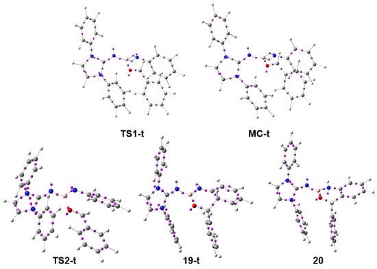 The H(r)/ρ(r) indicators are always negative, thus providing no particular discrimination. However, the similar QTAIM parameters at each CP1 and CP2 in both 19-t and 20 indicate no remarkable changes in the B2–O7 and C5–C6 bonding regions along the conversion of 19-t into the aromatic compound 20.