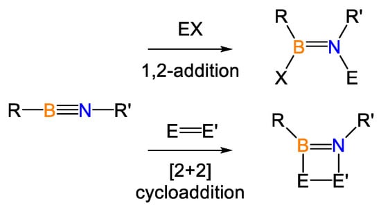 - Paetzold, P. Iminoboranes. Adv. Inorg. Chem. 1987, 31, 123–170. [Google Scholar]
